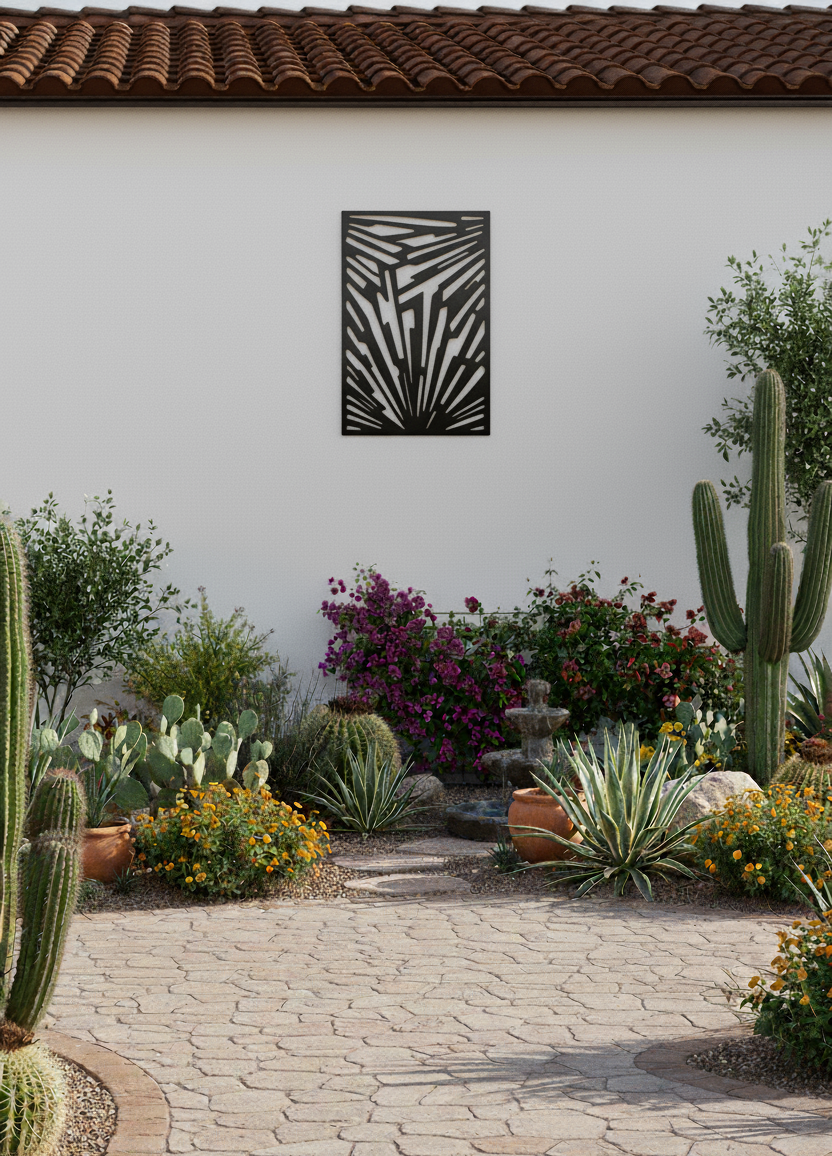 This is an exquisite laser-cut Art Deko decorative 1-piece panel in either high-strength corten steel or powder coated aluminum. This panel set is perfect for both indoor and outdoor decor.