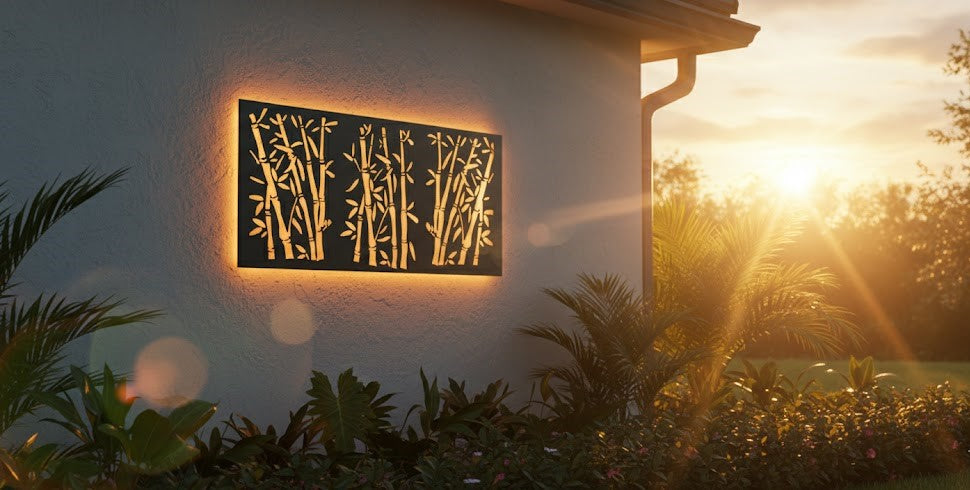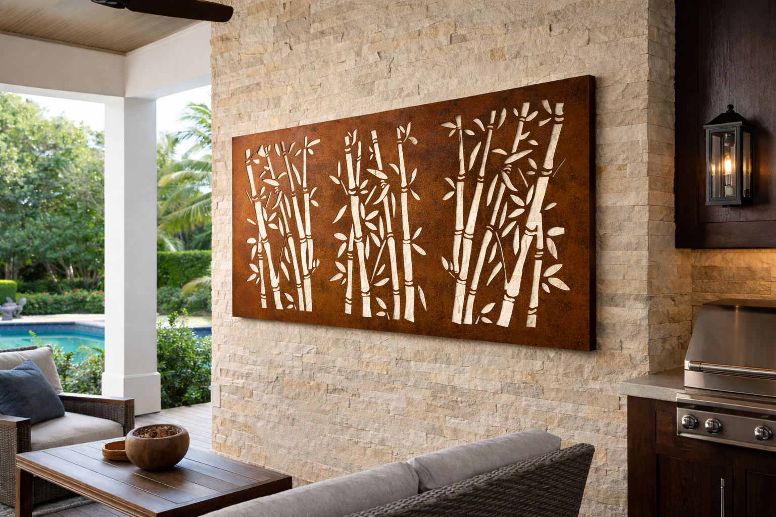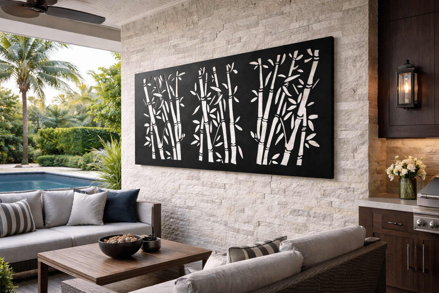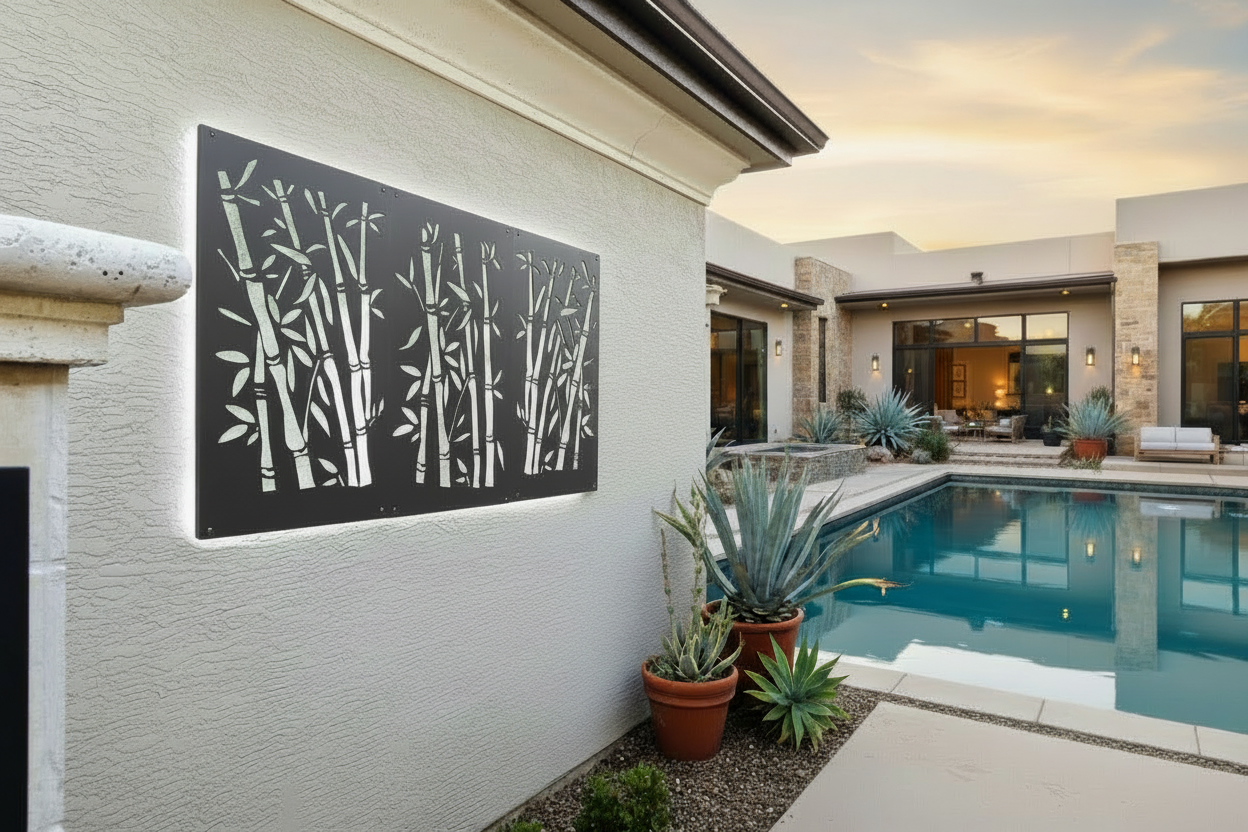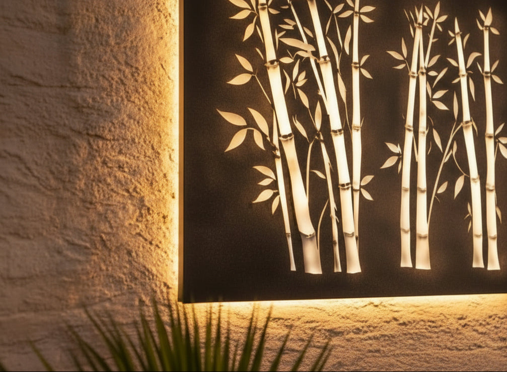 The flowing cutouts evoke the layered density of a bamboo thicket, creating a tranquil, nature-infused backdrop that feels both contemporary and timeless.